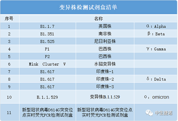 同時(shí)也研發(fā)出能區(qū)分不同變異株類型試劑盒,輔助用戶明確病原種類,已有變異株檢測試劑盒如下:
