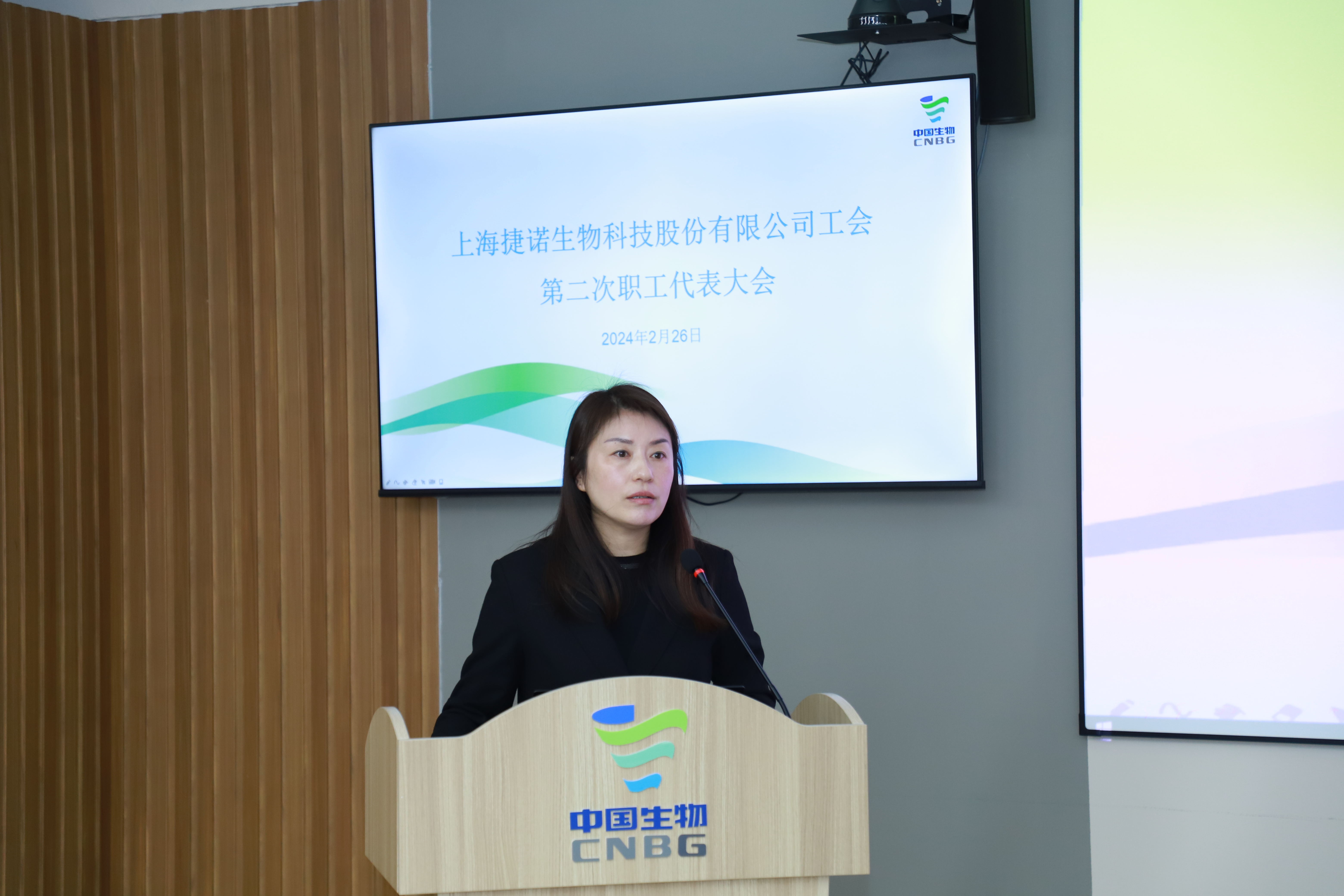 ▲捷諾生物工會主席李春英主持召開第二次職工代表大會