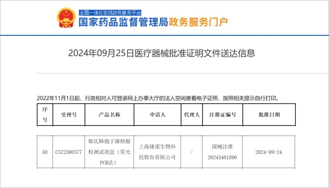 9月24日,上海捷諾生物科技股份有限公司(以下簡稱捷諾生物)研制的“耶氏肺孢子菌核酸檢測試劑盒(熒光PCR法)”正式獲得國家藥品監(jiān)督管理局(NMPA)頒發(fā)的三類醫(yī)療器械注冊證(注冊證號:國械注準(zhǔn)20243401890)。這是捷諾生物繼宮安麗®之后推出的又一重磅產(chǎn)品,也是真菌檢測產(chǎn)品線的首個(gè)上市產(chǎn)品。該產(chǎn)品上市不僅豐富了捷諾生物產(chǎn)品矩陣,也預(yù)示著捷諾生物進(jìn)入了深部真菌分子檢測的新賽道。