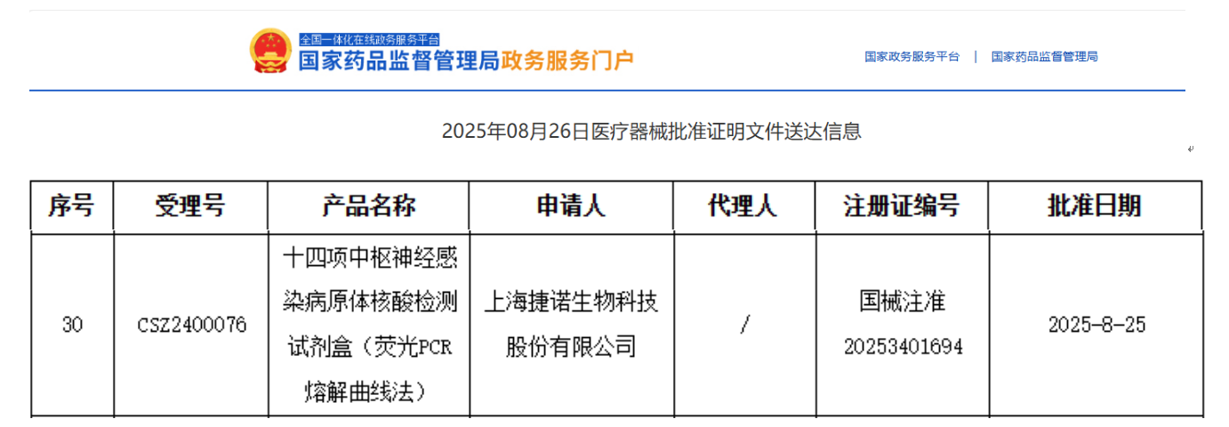 繼“十六項呼吸道病原體核酸檢測試劑盒”獲批上市后,中生捷諾再添喜訊。8月25日,公司“十四項中樞神經(jīng)感染病原體核酸檢測試劑盒(熒光PCR熔解曲線法)”正式獲批上市,這是國內(nèi)企業(yè)獲得的第一張由國家藥監(jiān)局批準的,用于中樞神經(jīng)系統(tǒng)感染輔助診斷的三類醫(yī)療器械注冊證。該試劑盒可檢測腦脊液樣本中14種中樞神經(jīng)系統(tǒng)感染(腦炎/腦膜炎)病原體核酸,用于中樞神經(jīng)系統(tǒng)感染(腦炎/腦膜炎)的輔助診斷,將有效解決臨床對于中樞神經(jīng)系統(tǒng)感染病原體診斷的難題。
