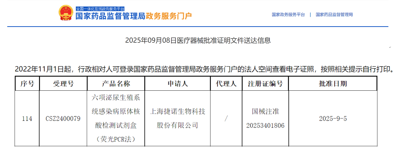 2025年9月5日,中生捷諾研制的“六項(xiàng)泌尿生殖系統(tǒng)感染病原體核酸檢測(cè)試劑盒(熒光 PCR 法)”正式獲得國(guó)家藥品監(jiān)督管理局(NMPA)頒發(fā)的三類醫(yī)療器械注冊(cè)證。這是中生捷諾一個(gè)月內(nèi)獲得的第三張注冊(cè)證,標(biāo)志著公司在感染性疾病檢測(cè)領(lǐng)域完成了呼吸道系統(tǒng)、中樞神經(jīng)系統(tǒng)和泌尿生殖系統(tǒng)三大核心產(chǎn)品線的戰(zhàn)略布局。